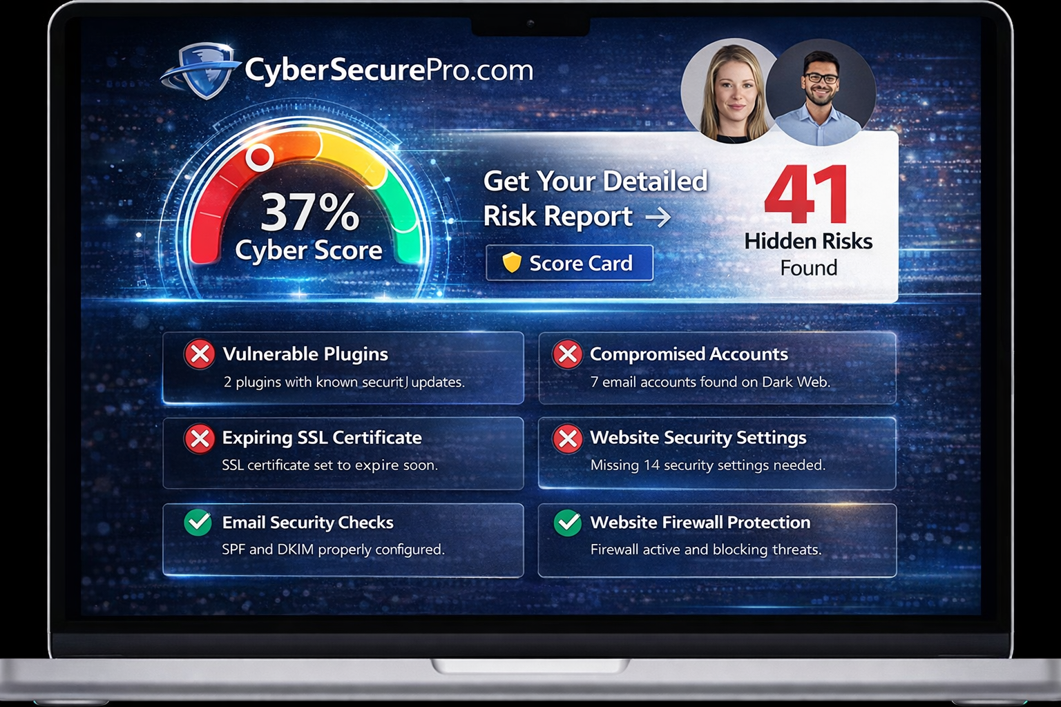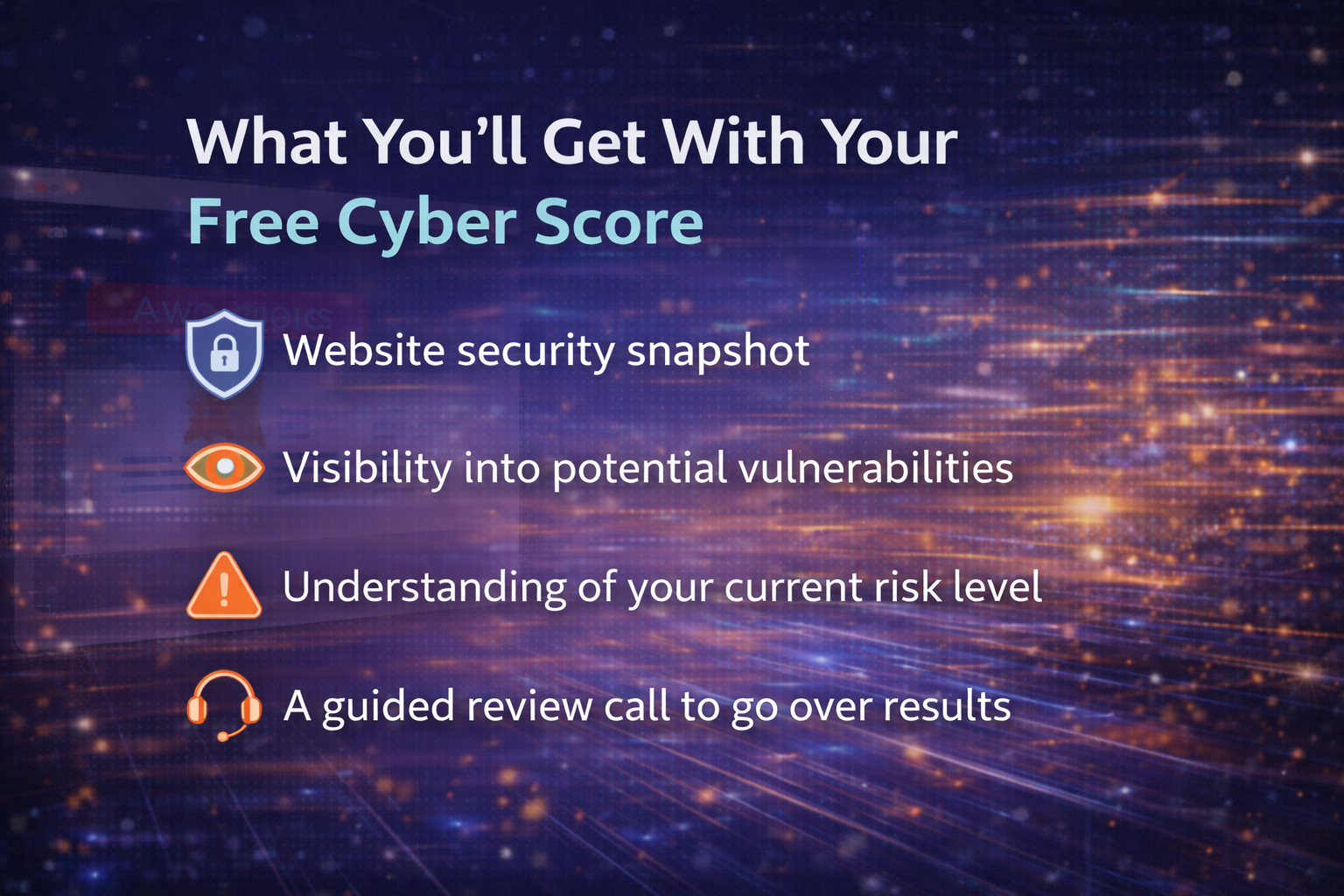 Get a clear and simple overview of your website’s security with our free Cyber Score. We provide a quick snapshot of how well your site is protected, along with insights into potential vulnerabilities that could put your business at risk. You’ll also gain a better understanding of your current risk level, so you can make informed decisions moving forward. To help you get the most value, we’ll walk you through your results in a guided review call—explaining what everything means and what steps you can take to improve your security with confidence.