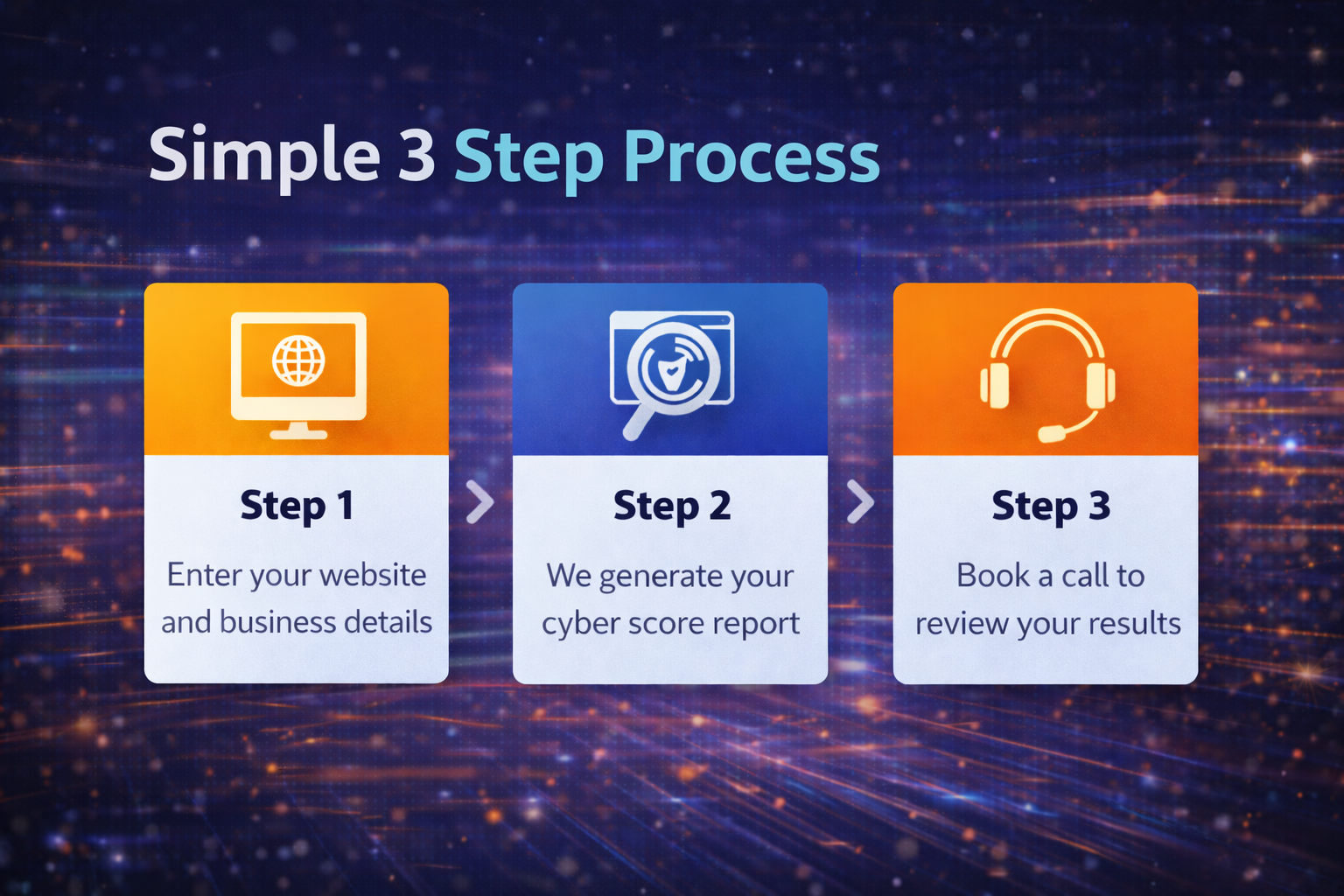 Getting your Cyber Score is quick and easy. First, simply enter your website and a few basic business details so we can assess your current setup. Next, we generate your personalized cyber score report, highlighting key insights about your website’s security and potential vulnerabilities. Finally, you can book a guided review call where we walk you through your results, answer your questions, and help you understand the next steps to better protect your business.